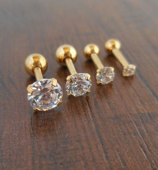 Triple Forward Helix Jewelry Gold Tone Titanium Clear Prong Set CZ Cartilage Earrings Cubic Zirconia 16G 1/4" 2-5mm Ball Back Ear