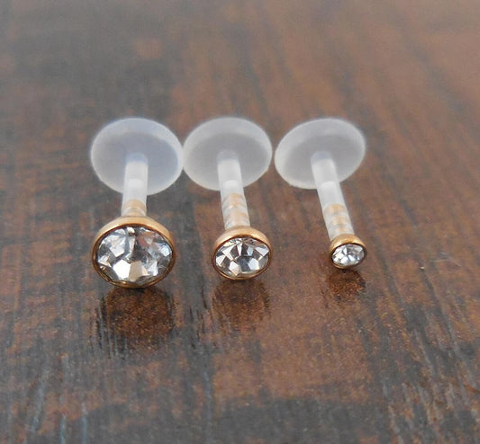 16G 6mm or 8mm BioFlex BioPlast Earring Cartilage Tragus Rose Gold Tone Titanium Clear CZ Triple Forward Helix