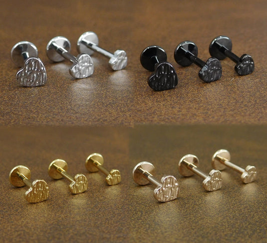 Unique 3-4mm Hammered Heart Stud Earrings, Threadless Push Pin Style Gold Tone Nose Ring, Petite Rustic Natural Look Earrings, 16G, 18G, 20G
