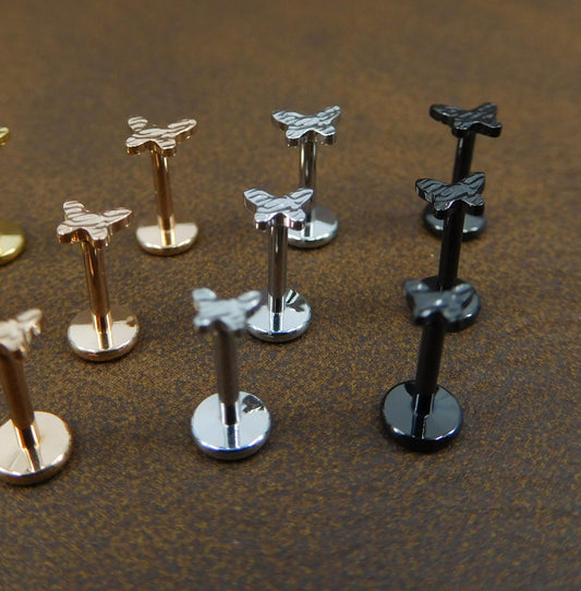 Rustic Butterfly Stud Earrings, Threadless Push Pin Gold Tone Stainless Nose Ring, Hammered Butterfly Cartilage Earrings, 16G, 18G, 20G