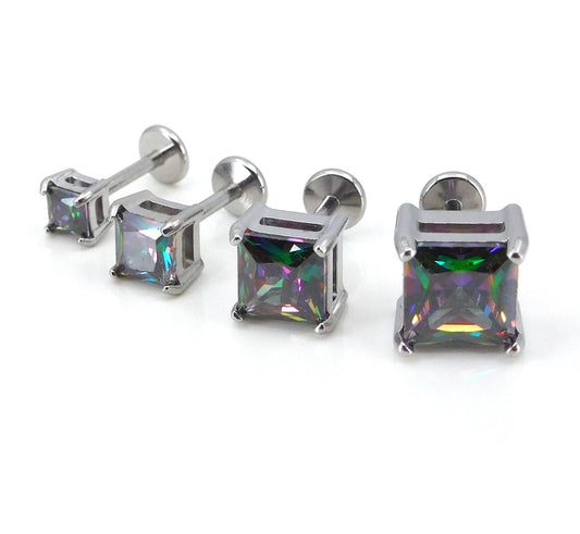 Rainbow Surgical Steel Stud Earring: Threadless Princess Cut Prong Set Labret Nose Ring