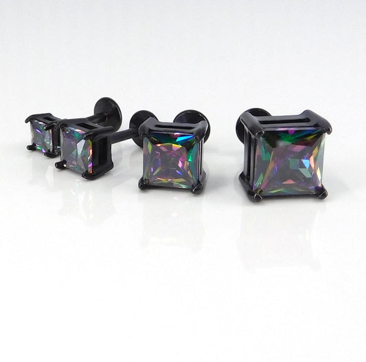 Black Rainbow Stud Earring: Threadless Princess Cut Prong Set Labret Nose Ring