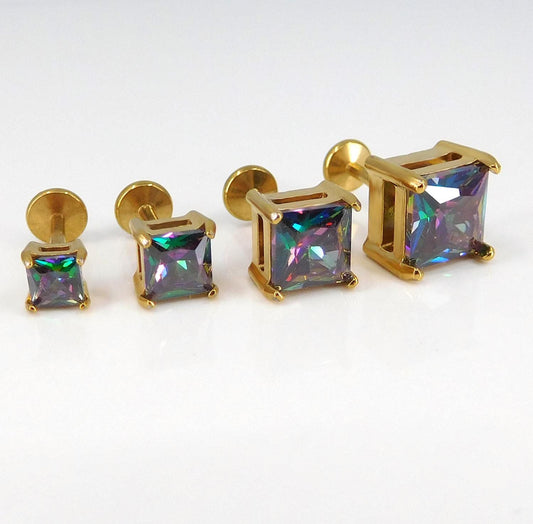 Rainbow Gold PVD Stud Earring: Threadless Princess Cut Prong Set Labret Nose Ring
