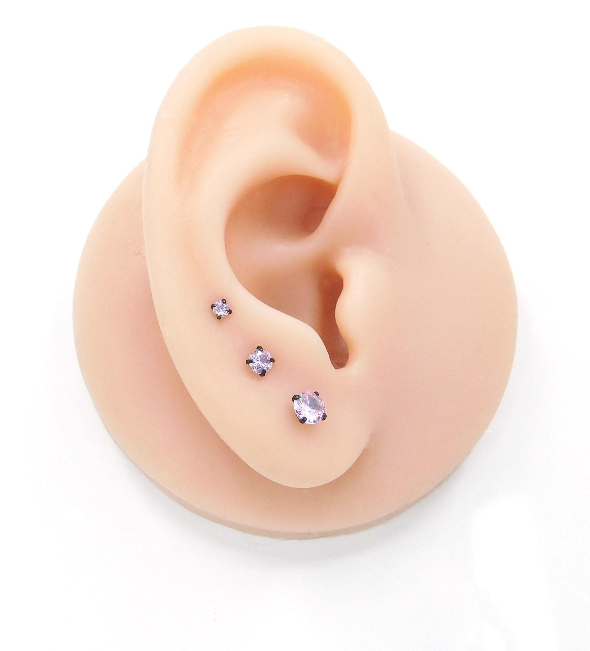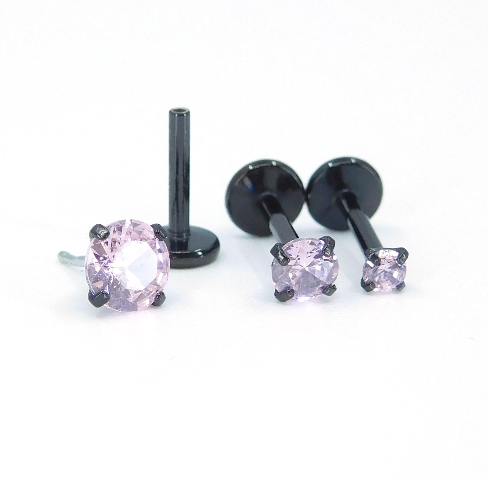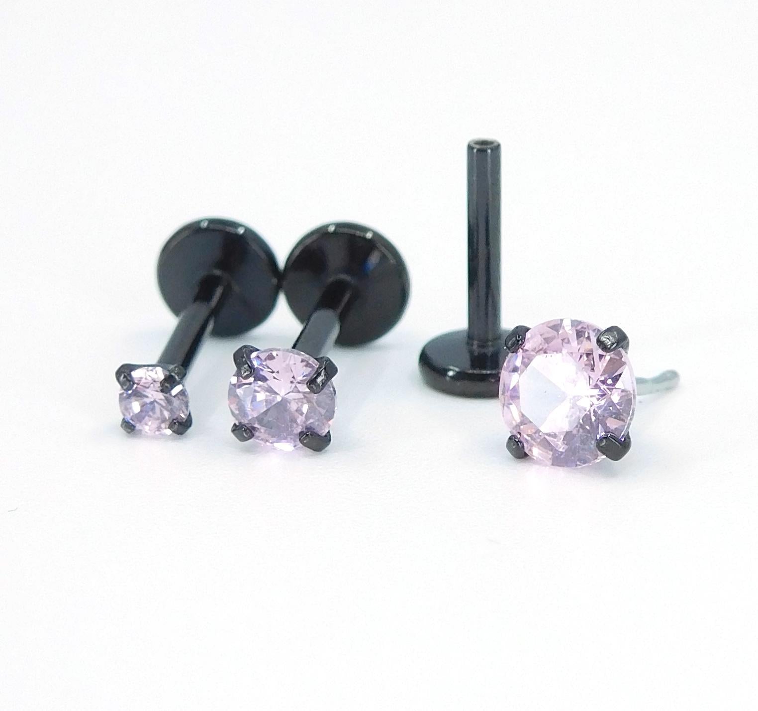 16G, 18G, 20G Pink Threadless Stud Earrings, Cartilage Cubic Zirconia Tragus Rings, Prong Set Pink CZ Black PVD Flat Back Labret Nose Ring