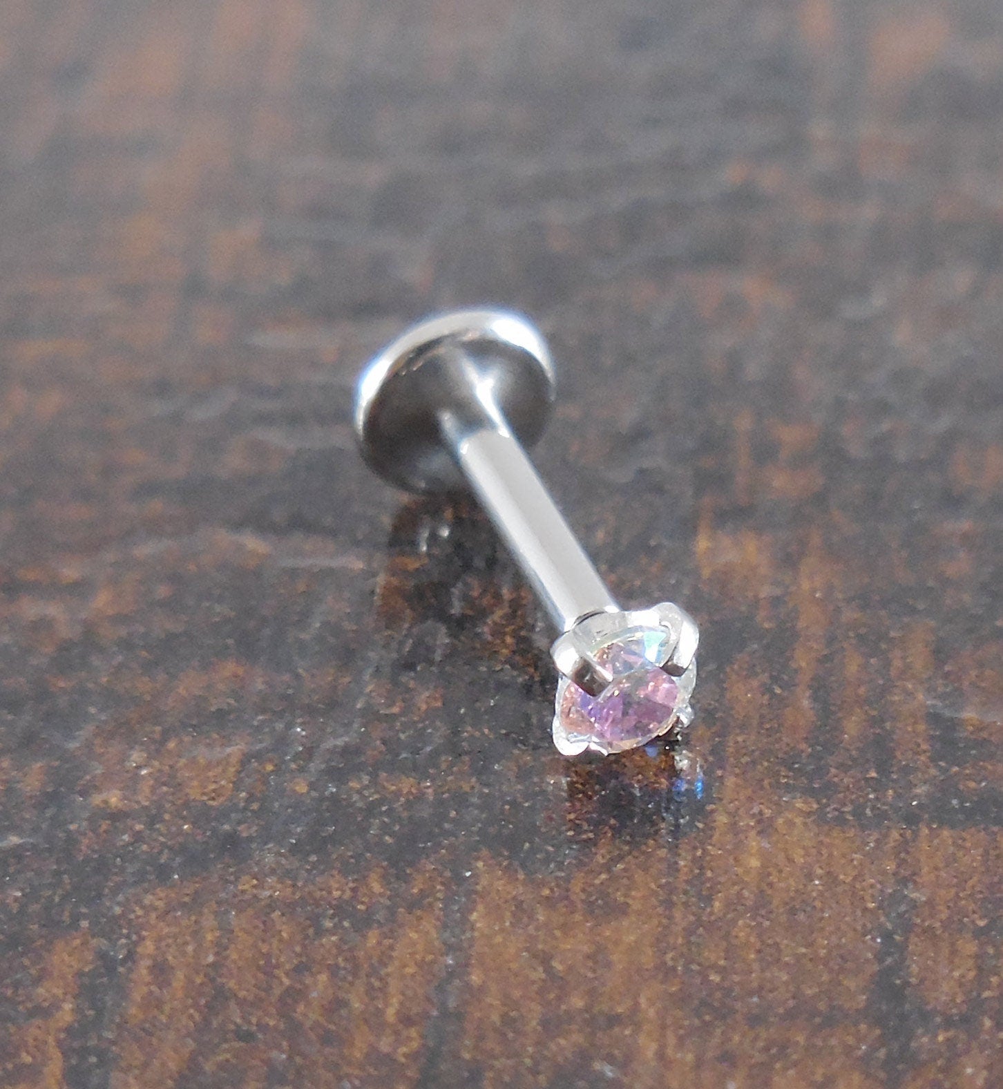 This listing is for one ring unless you choose to purchase all three or 5 options, the size is your choice. You can choose 2mm, 2.5mm 3mm 3.5mm 4mm or lot options. These Aurora Borealis stone are very unique. they can look like different colors depending on how the light reflects off them. They are set in the prong by hand for accuracy and internally threaded for comfort. These are unique in that they do not have threads. The stone is held in place by the tension created with a slight bend in the pin. For snug fit bend the pin a little more, for a loose fit you can straighten the pin.