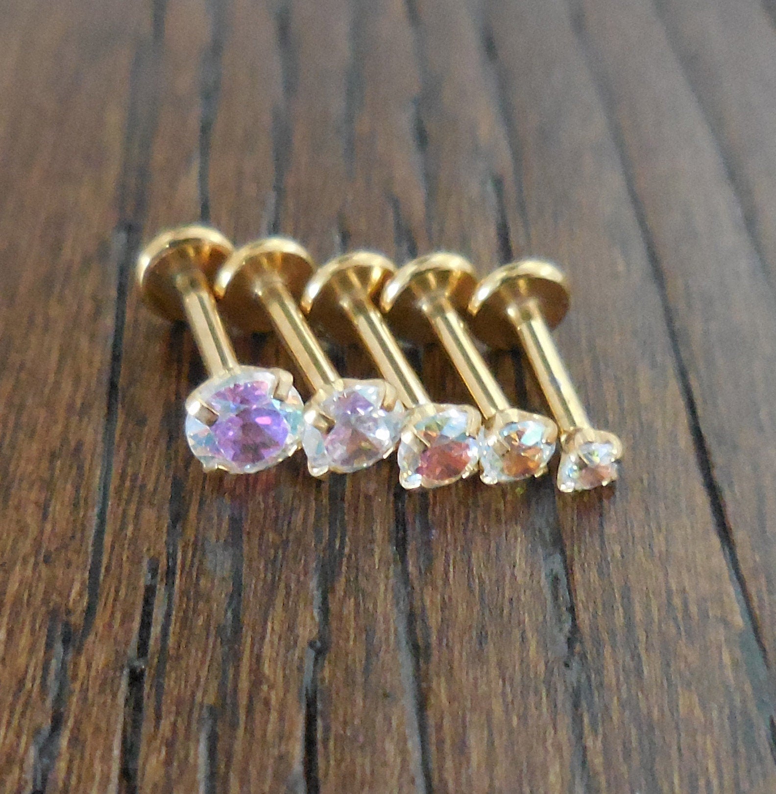 This listing is for one ring unless you choose to purchase all three or 5 options, the size is your choice. You can choose 2mm, 2.5mm 3mm 3.5mm 4mm or lot options. The Aurora Borealis crystal stones are very bright with sparkle that impresses. They are set in the prong by hand for accuracy and internally threaded for comfort. These are unique in that they do not have threads. The stone is held in place by the tension created with a slight bend in the pin. For snug fit bend the pin a little more, for a loose fit you can straighten the pin.
