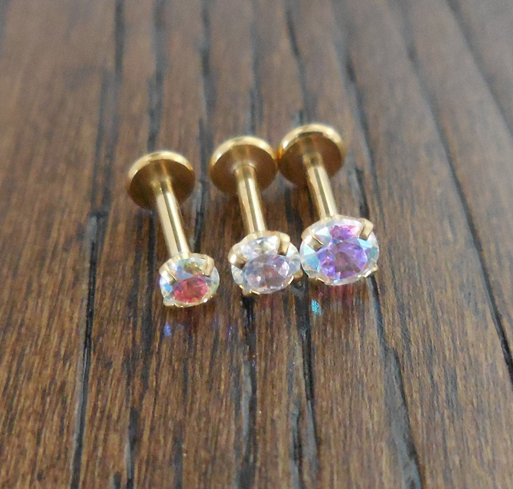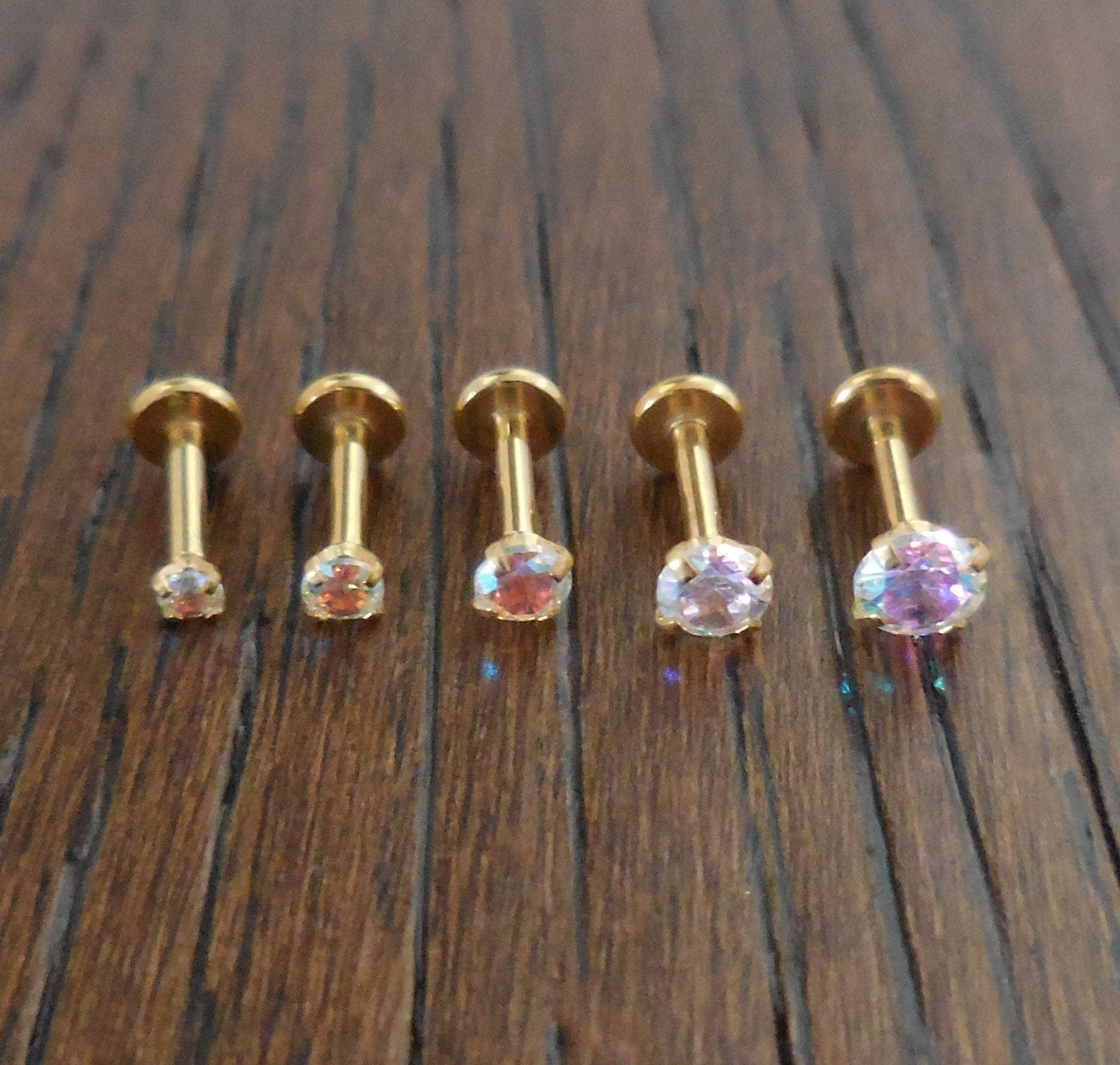 16g 2-4mm Tragus 6mm-8mm AB Crystal Push Pin Labret Nose Ring Titanium Prong Set Stone Cartilage Earrings Gold Tone Triple Helix Thread Less