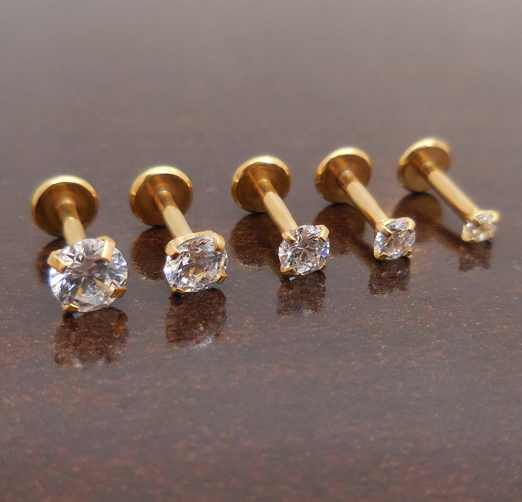 16g 2-4mm Tragus 6mm-8mm Threadless Push Pin Labret Nose Ring Cartilage Earrings Gold Tone Titanium Prong Set Clear CZ Stone Triple Helix