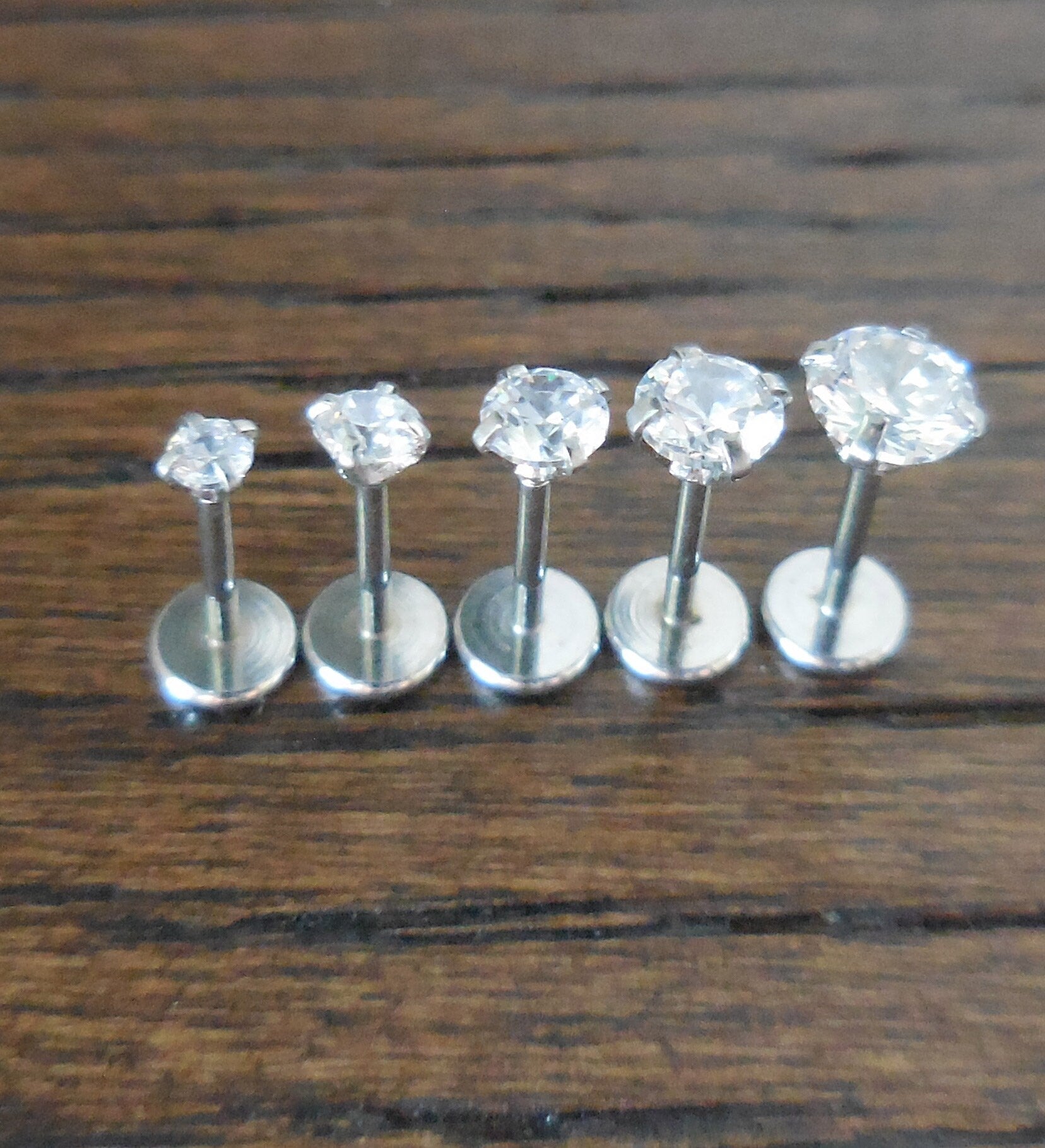 This listing is for one ring unless you choose to purchase all three or 5 options, the size is your choice. You can choose 2mm, 2.5mm 3mm 3.5mm 4mm or lot options. These are very bright and sparkly. They look very clear and provide an expensive appearance without the cost. They are set in the prong by hand for accuracy and internally threaded for comfort. These are unique in that they do not have threads. The stone is held in place by the tension created with a slight bend in the pin. For snug fit bend the pin a little more, for a loose fit you can straighten the pin.<BR><BR>