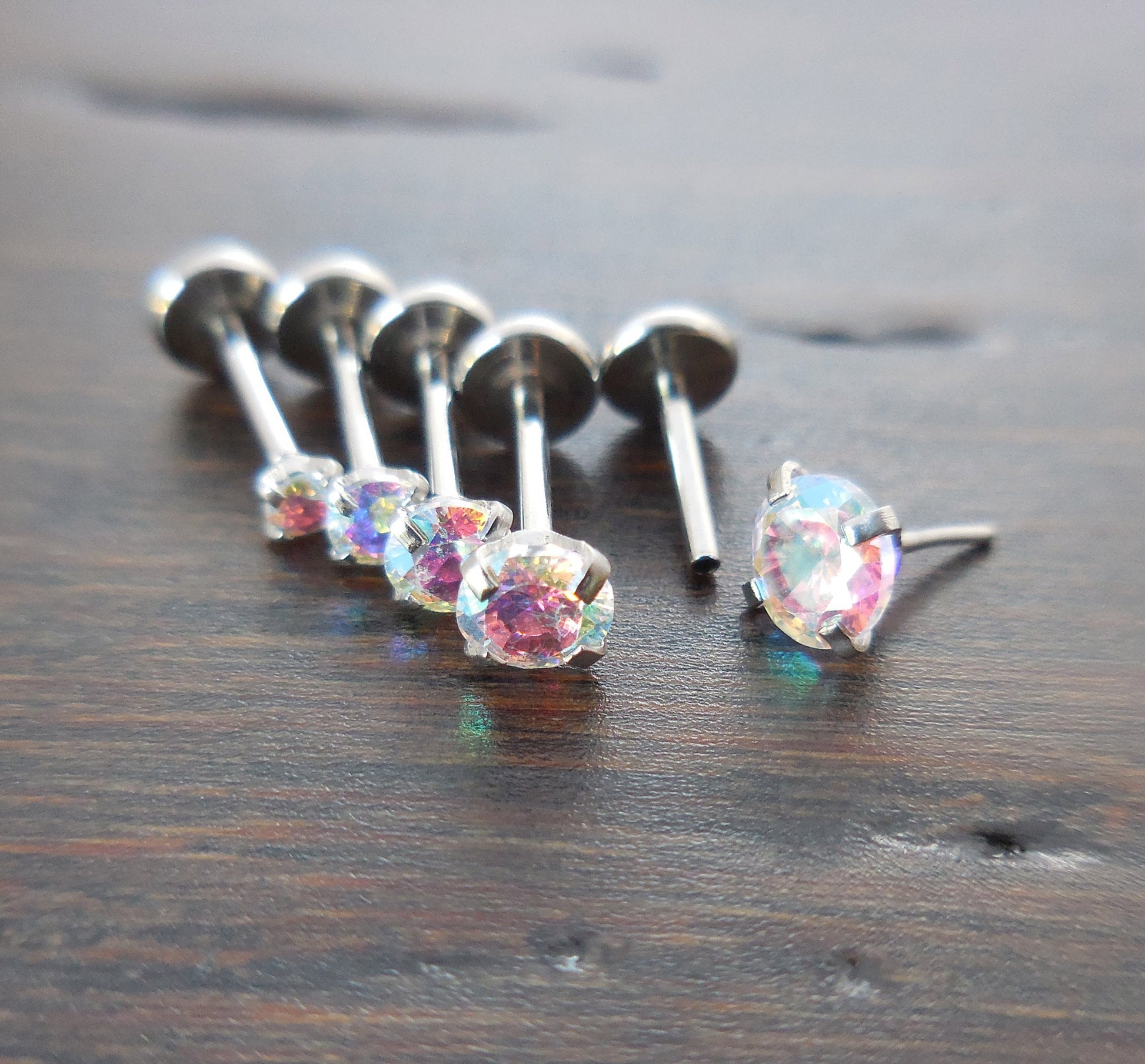 20G 2-4mm Tragus Threadless 6mm-8mm Push Pin Triple Helix Nose Ring Labret Lip Earrings Steel Prong Set AB Rainbow Auroral Borealis Crystal