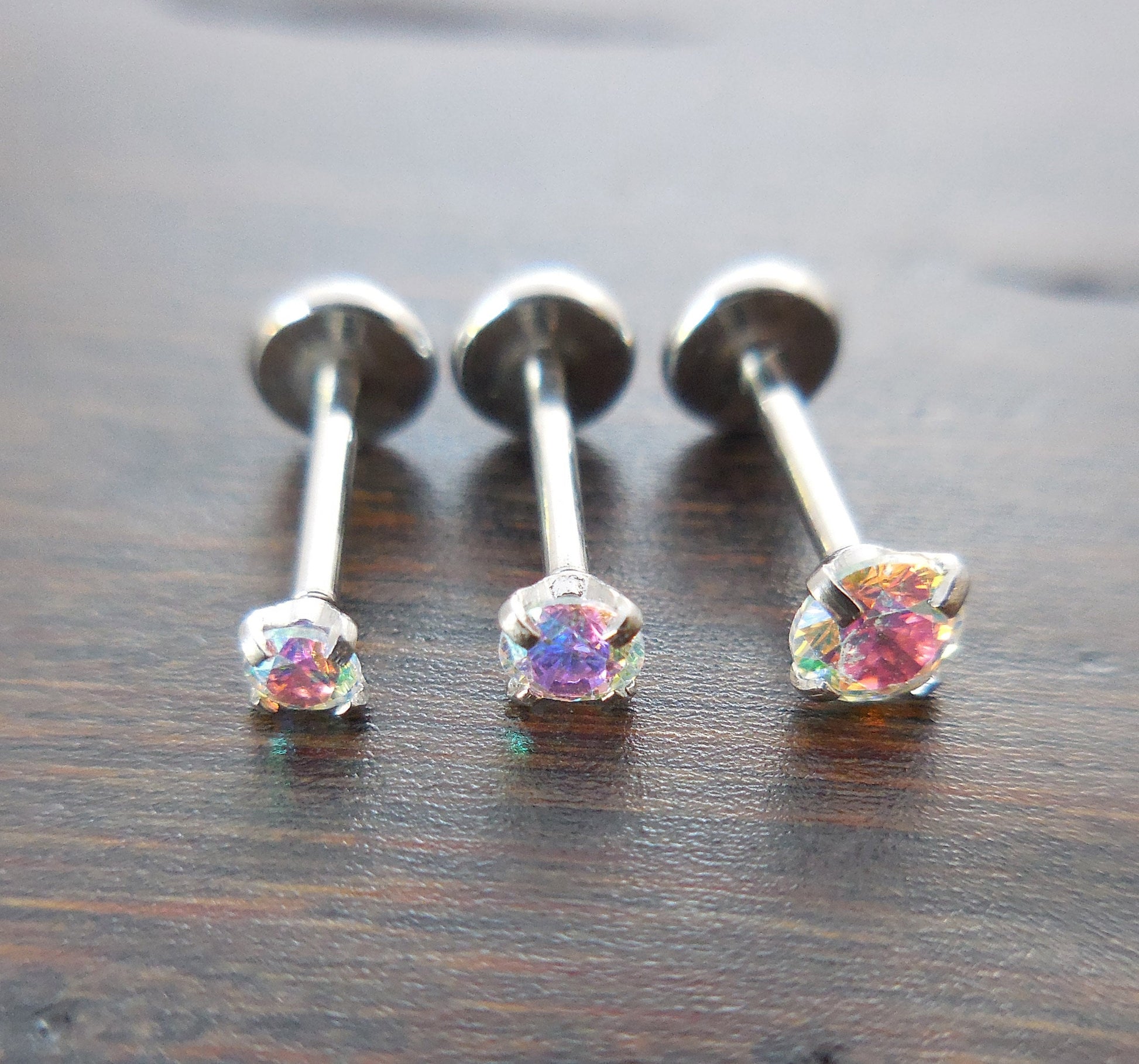 This listing is for one ring unless you choose to purchase all three or 5 options, the size is your choice. You can choose 2mm, 2.5mm 3mm 3.5mm 4mm or lot options. These are very unique Aurora Borealis crystals. They offer many different colors as light refracts differently from different angles. They are set in the prong by hand for accuracy and internally threaded for comfort. These are unique in that they do not have threads. The stone is held in place by the tension created with a slight bend in the pin. For snug fit bend the pin a little more, for a loose fit you can straighten the pin.