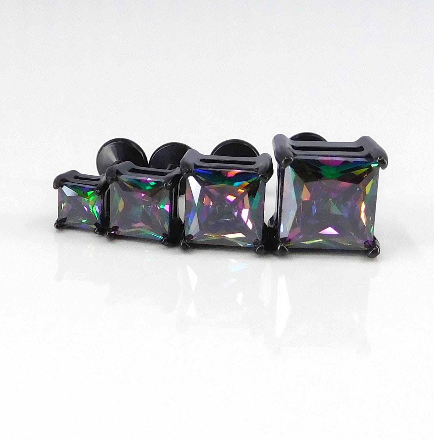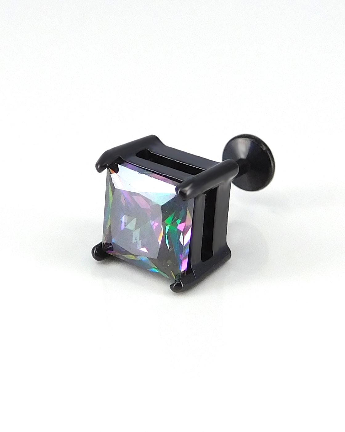 This Black Rainbow Stud Earring is a very classy, cute and petite Dark Rainbow CZ stone in a black PVD from setting. This are a very unique dark rainbow stone. Similar to AB crystal but is much darker. You get an array of dark light refractions from it. It has a flatback design for comfort and long term wear.