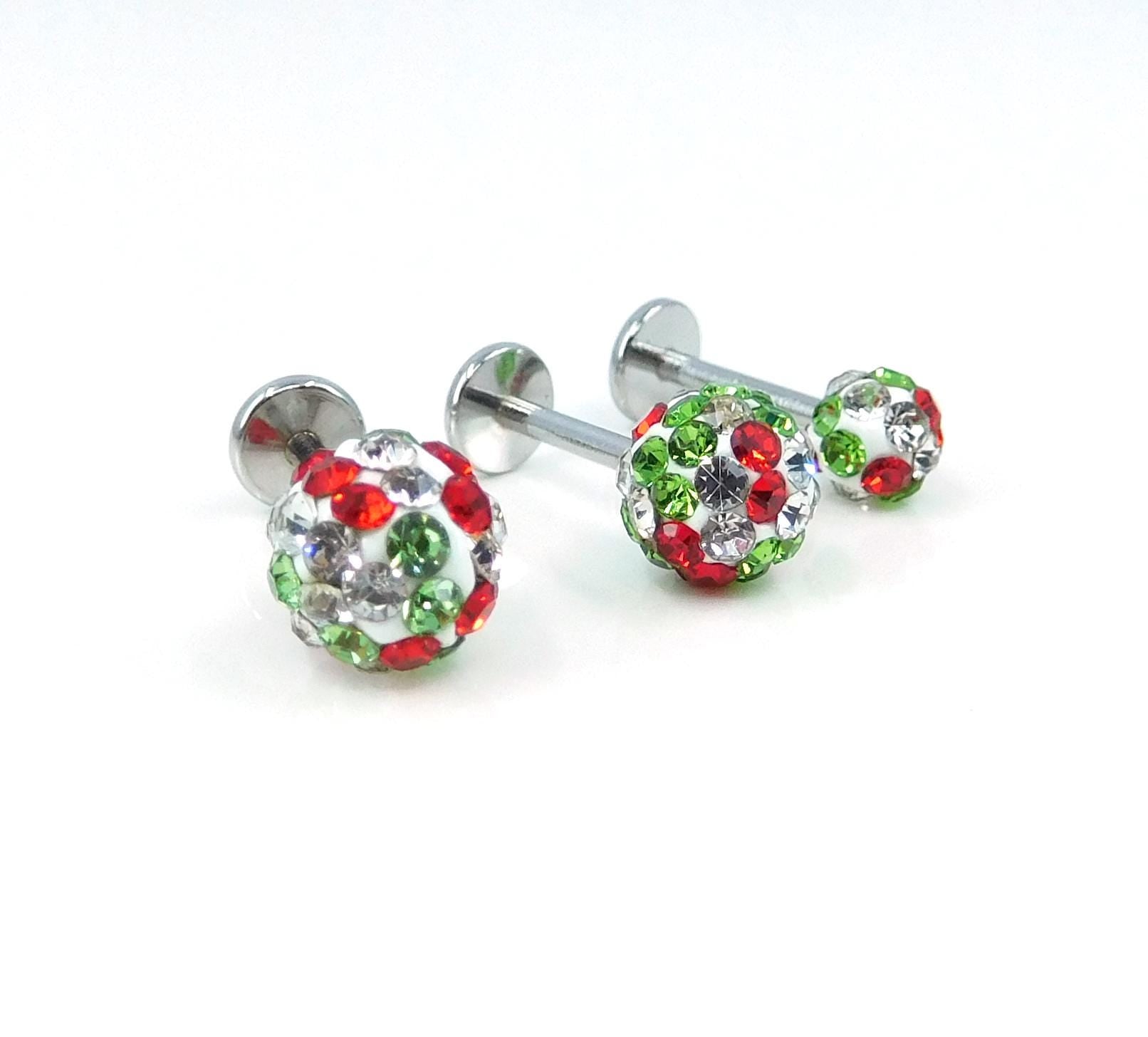 Christmas Crystal Ball Sphere Threadless Stud Earrings - 16G, 18G, 20G Holiday Cartilage Tragus Earrings