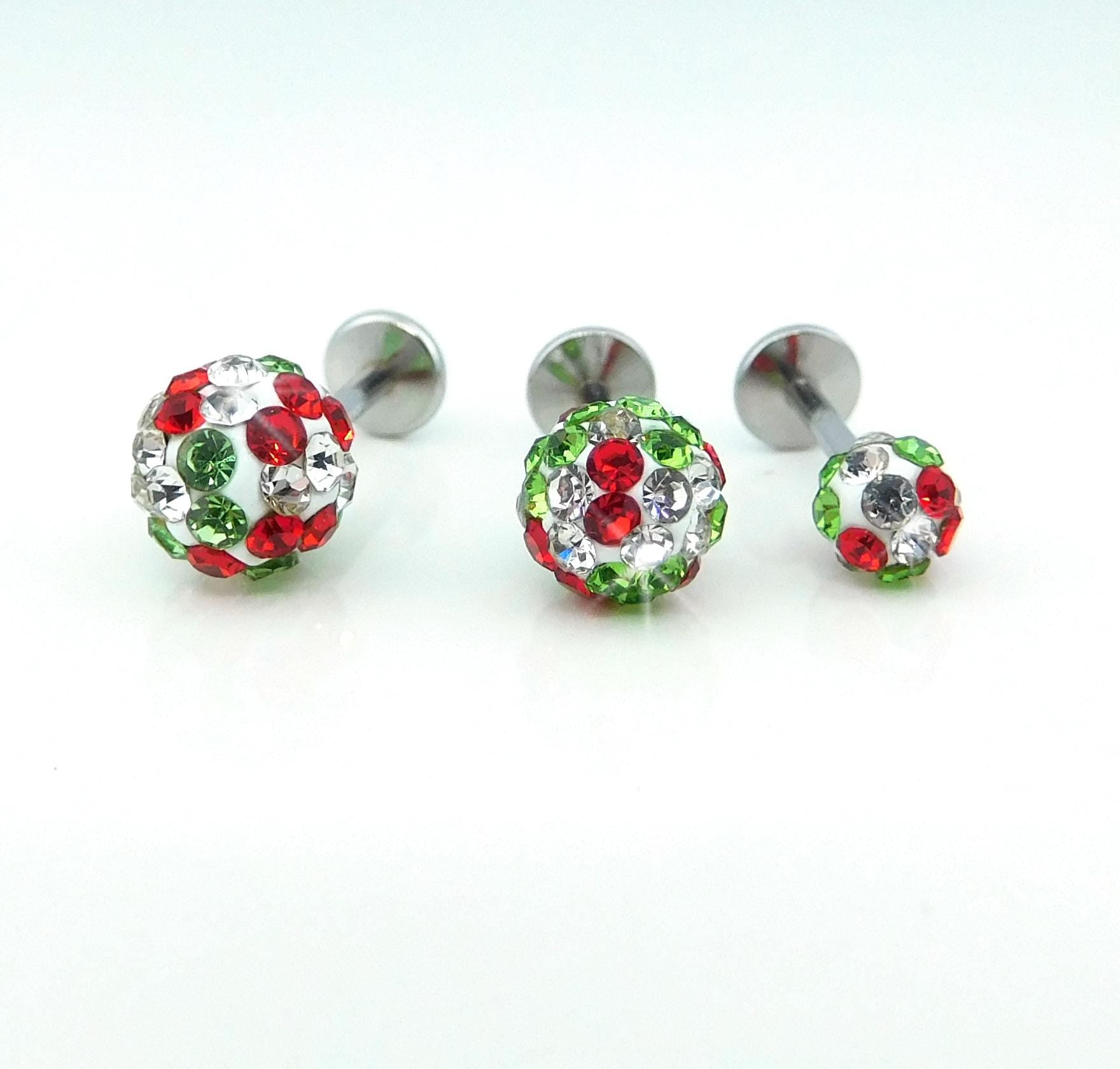 This is a very classy, cute and unique Christmas colors sphere threadless rings. Each sphere is covered in Red, Green and Clear Swarovski crystals. It has a flatback design for comfort and long term wear.