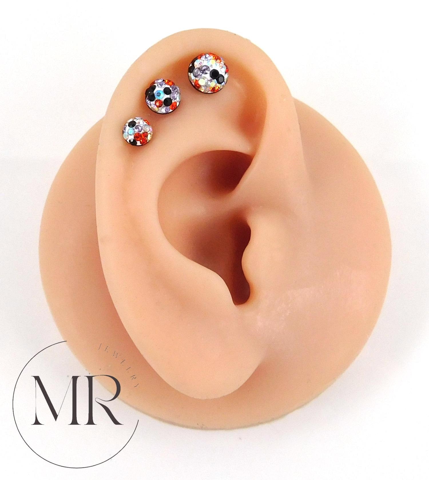 Get ready for the haunted season with our dazzling Halloween Pave Crystal Half Ball Threadless Stud! This petite and sparkly half-ball features a stunning array of black and/or orange pave-set crystals that catch the light perfectly. It's the perfect subtle nod to spooky season, or a chic piece of dark glam jewelry year-round. Our push-pin style ensures easy insertion and a secure, comfortable fit that is ideal for all-day wear and even sleeping. Designed to look great in multiple locations, including your Cartilage, Helix, Tragus, Lobe, or Nose Piercing.
