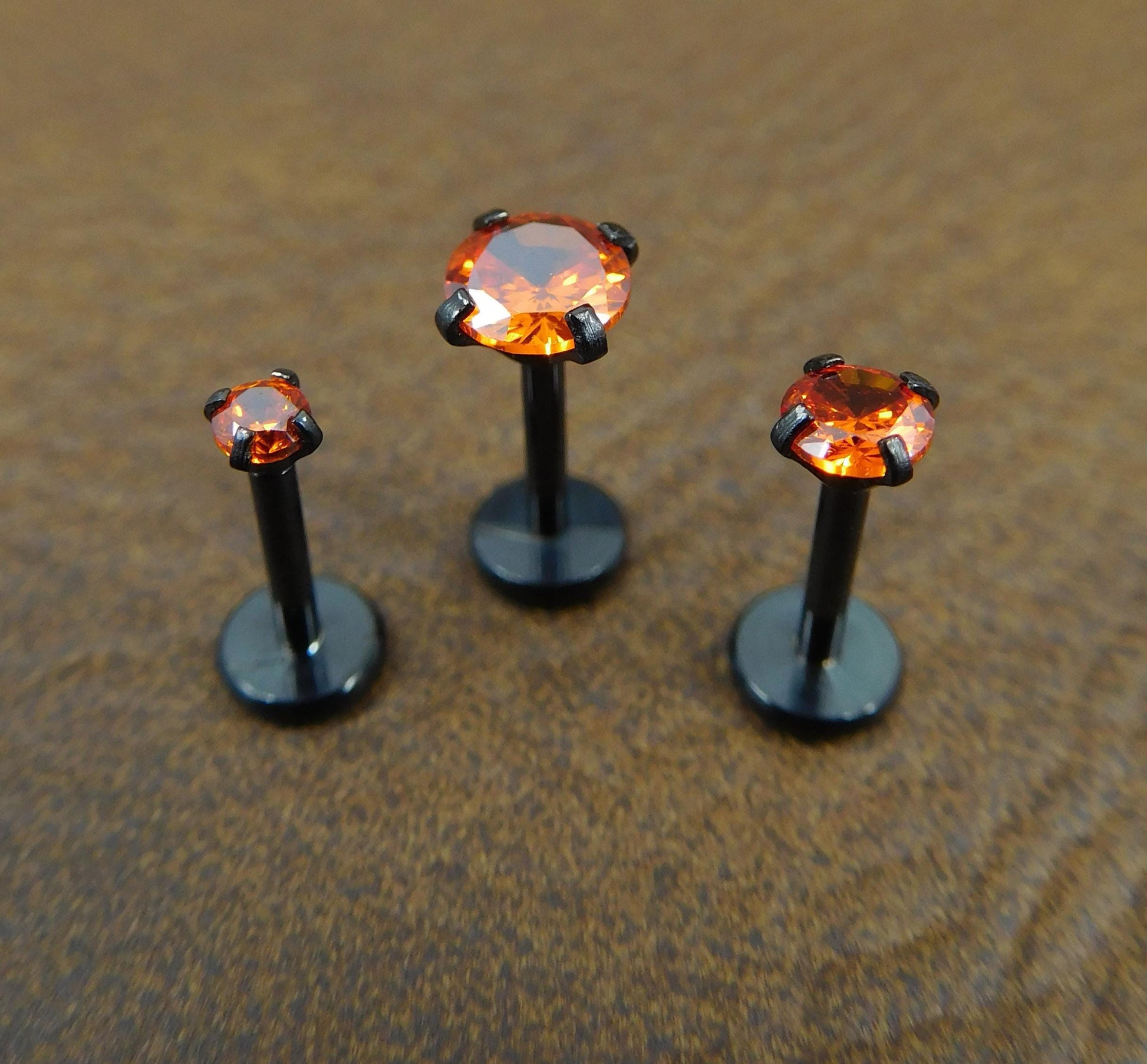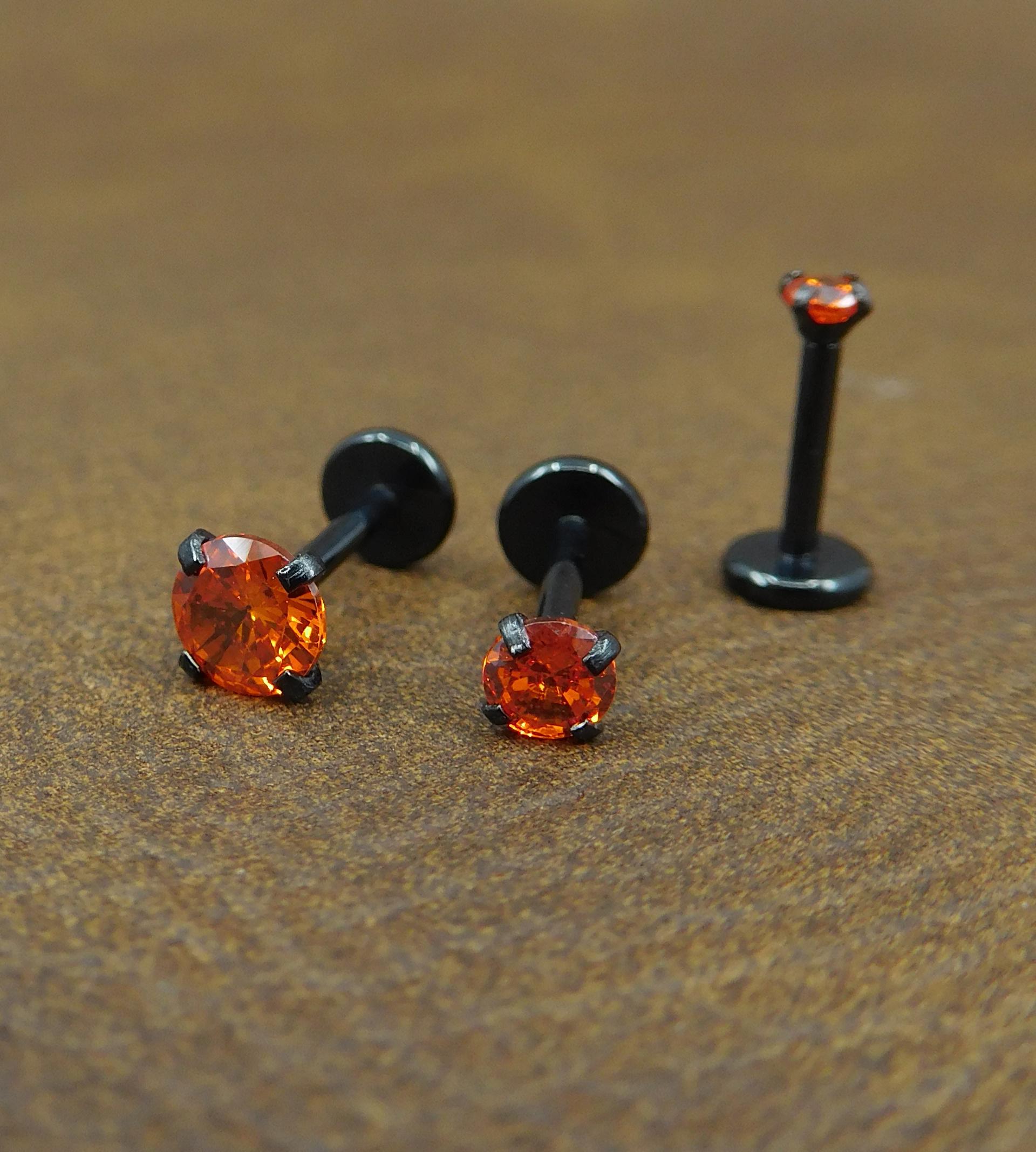 This is a very classy, cute and petite orange CZ stone in a black PVD from setting. It has a flatback design for comfort and long term wear.