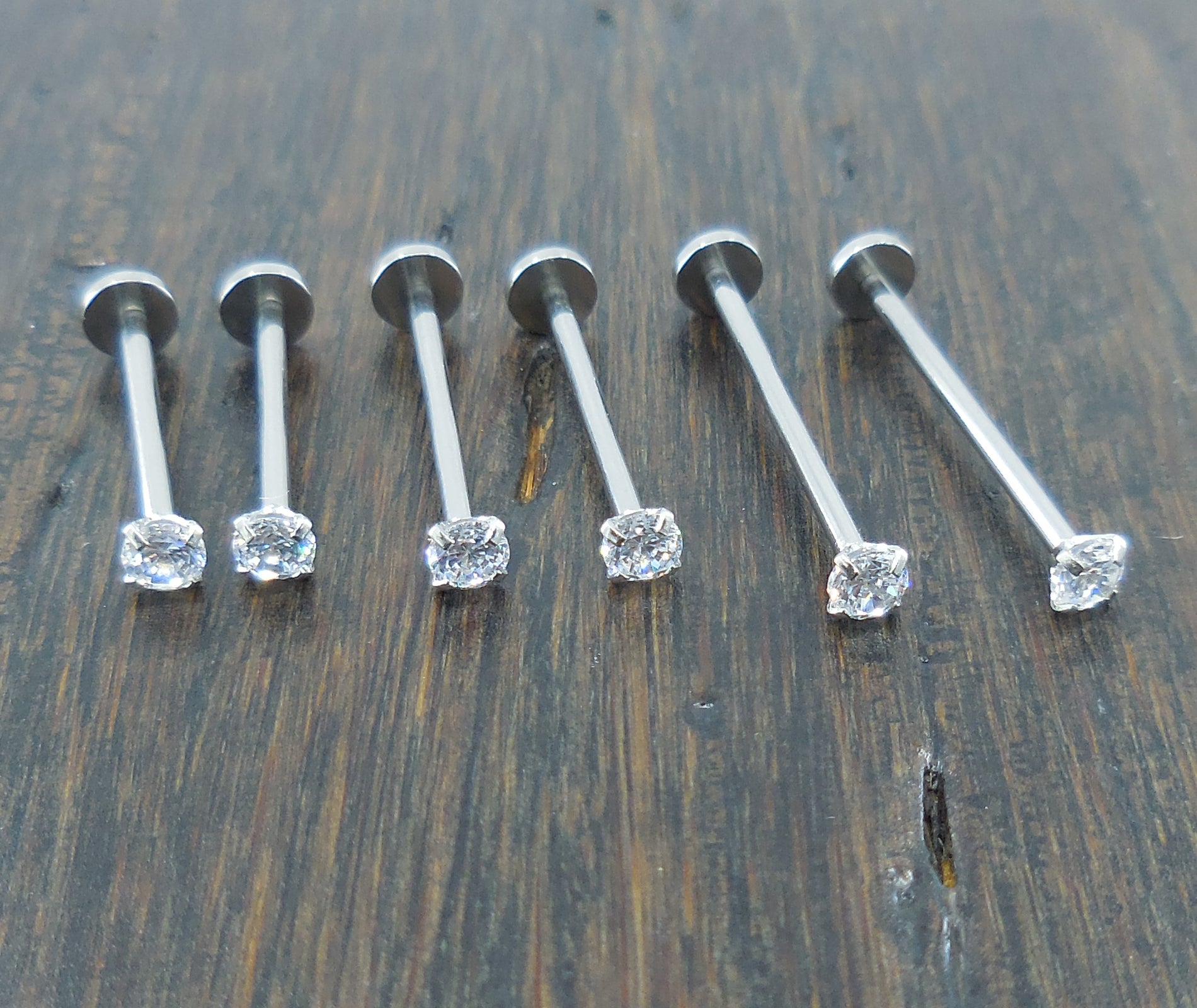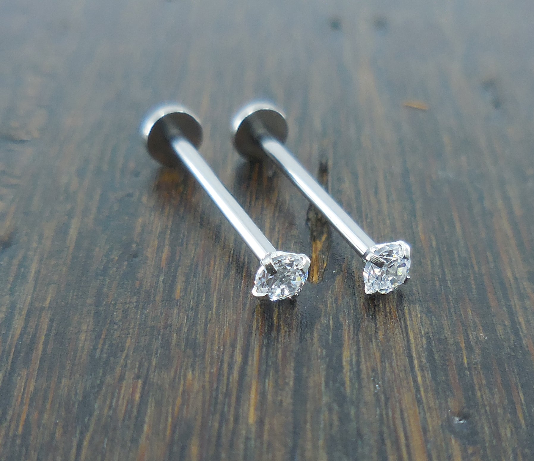 Pair Dimple Maker Cheek Piercings 3mm Clear Crystal CZ 16G 14mm, 16mm, 19mm Stainless Steel Internally Threaded Prong Set Labret Rings