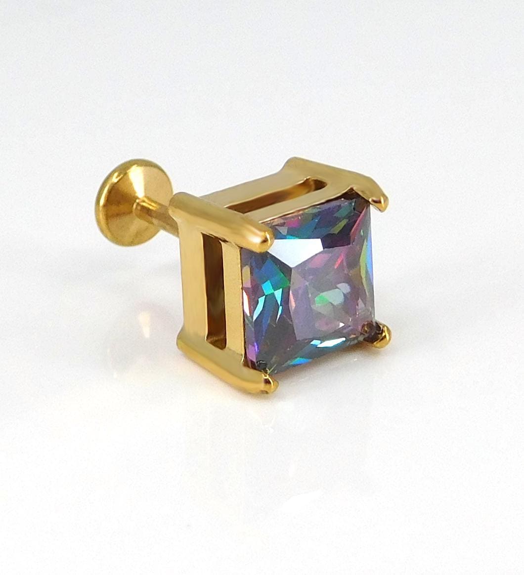 This Rainbow Gold PVD Stud Earring is a very classy, cute and petite Dark Rainbow CZ stone in a surgical steel setting. This are a very unique dark rainbow stone. Similar to AB crystal but is much darker. You get an array of dark light refractions from it. It has a flatback design for comfort and long term wear.